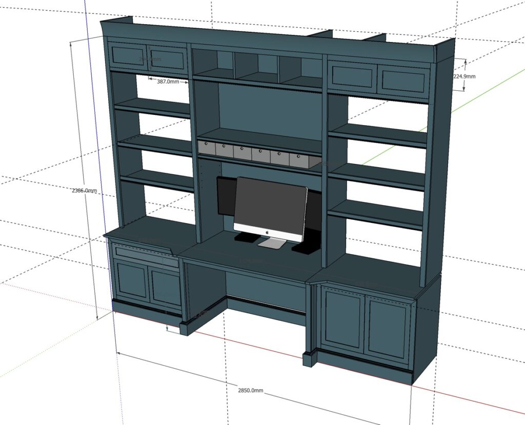 Enfin, er moest een grote *bibliotheque* komen. Pinterest werd geraadpleegd — het moderne equivalent van kijken in de winkel, maar dan zonder sociaal contact. Ideeën genoeg: een boekenkast met een geïntegreerd bureau, plaats voor printer, router, en andere electronische apparaten die zacht zoemen zoals een bijenkorf in het veld. En ja, ook boeken. Als er nog plaats is tenminste.